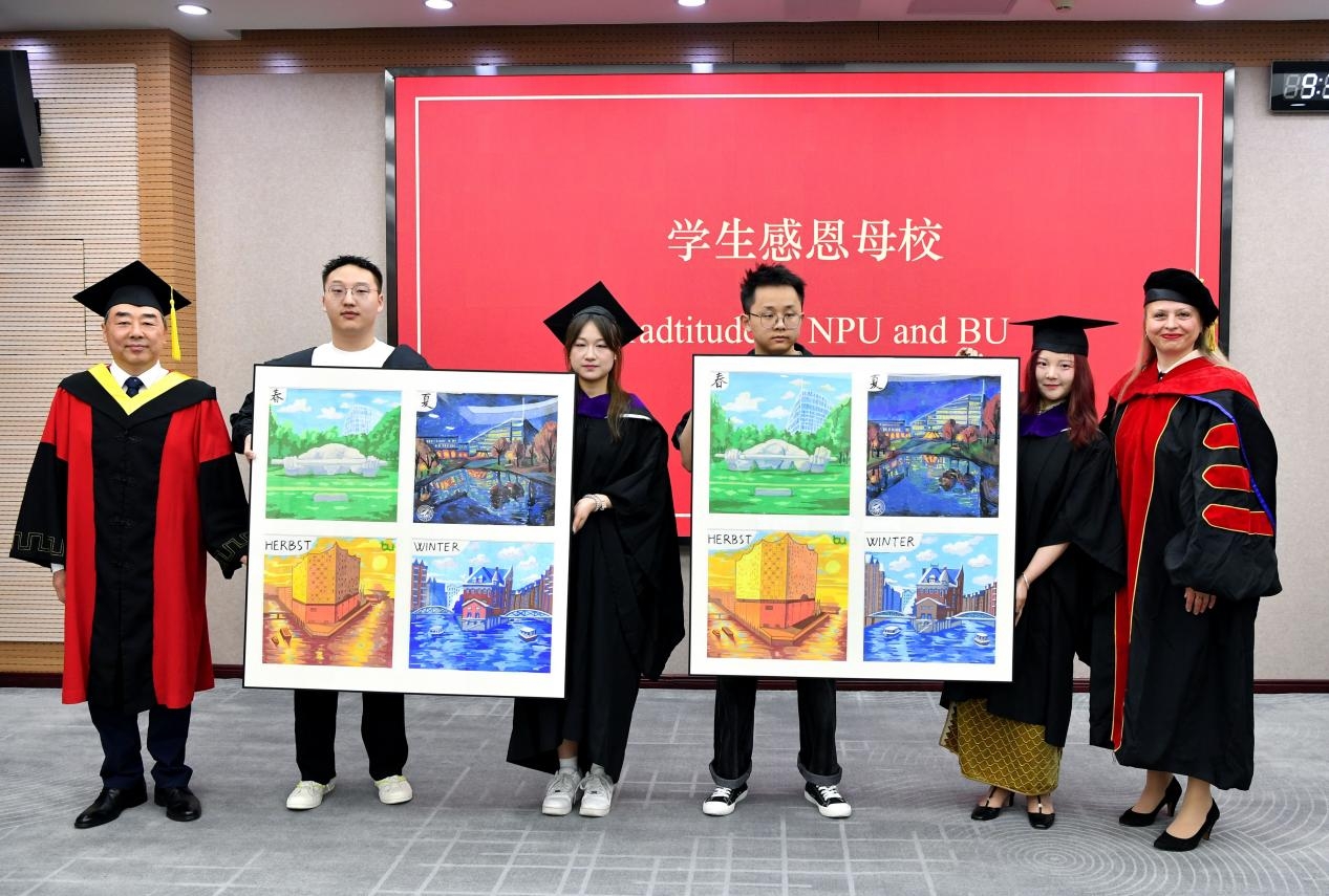 随后,毕业生代表卞辰晨深情回顾了求学时光,感恩母校与导师的培养。研究生院常务副院长朱继宏、国际合作处处长孔杰、品牌应用科学大学校国际合作学术总监Stefan M.F. Waller共同为优秀毕业生颁发荣誉证书。毕业生向两校赠予他们手绘的礼物,用春夏秋冬描述自己在西工大和品牌应用科学大学的求学时光。副校长岳晓奎、副校长Yonca Limon-Calisan接受了赠予。