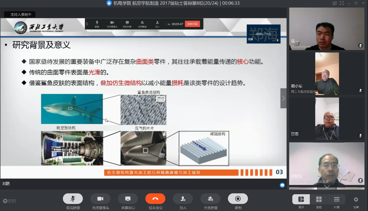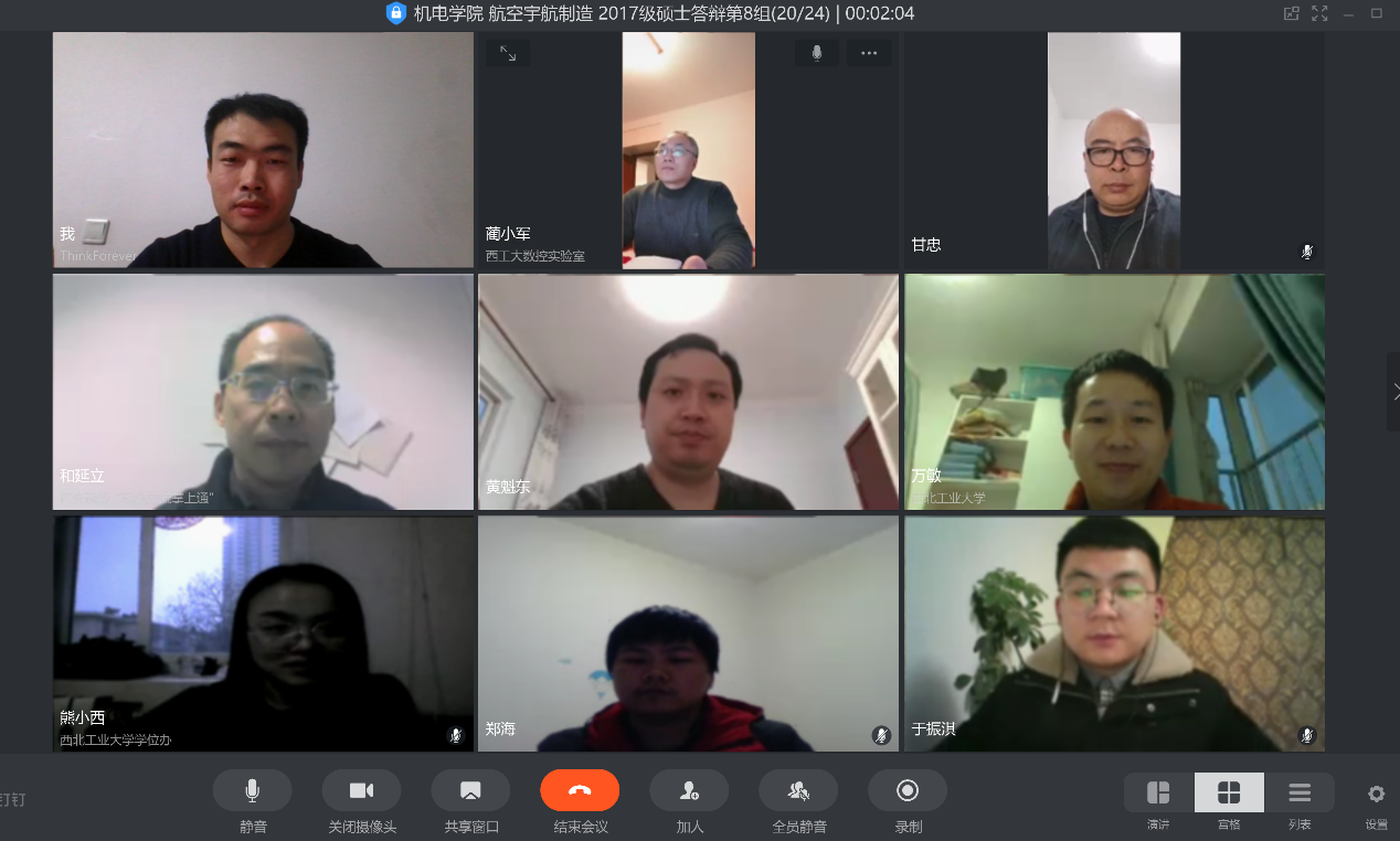 答辩正式开始,秘书周建强老师宣布开云kaiyun登录入口航空宇航制造工程专业 2017级硕士研究生第八答辩小组硕士答辩会议开始,宣读了答辩委员会主席和成员,并介绍了整个答辩流程。本次答辩由和延立副教授担任前2位研究生的答辩委员会主席,万敏教授担任后7位研究生的答辩委员会主席,其他委员会成员为甘忠副教授、黄魁东副教授和蔺小军研究员。随后,9名学生依次有序地进行了视频答辩。按照预演模拟时的安排,学生进入答辩时,打开话筒和摄像头,其他学生关闭话筒和摄像头以避免干扰。在答辩委员会主席的主持下,首先由答辩秘书对答辩研究生的基本情况、论文评阅情况进行说明和介绍,然后由答辩学生宣读《学位论文原创性声明》,并开始共享屏幕进行答辩汇报,之后由答辩委员会进行问题质询。学生在答辩过程中答辩流畅,采用钉钉的录像功能对答辩全程进行录音、录像,并专门安排了其他设备进行了录音备份。校研究生院学位办邢妍老师参与了视频答辩全过程,校督导组毛根旺老师听取了最后两名学生高新宇和郑海的答辩。