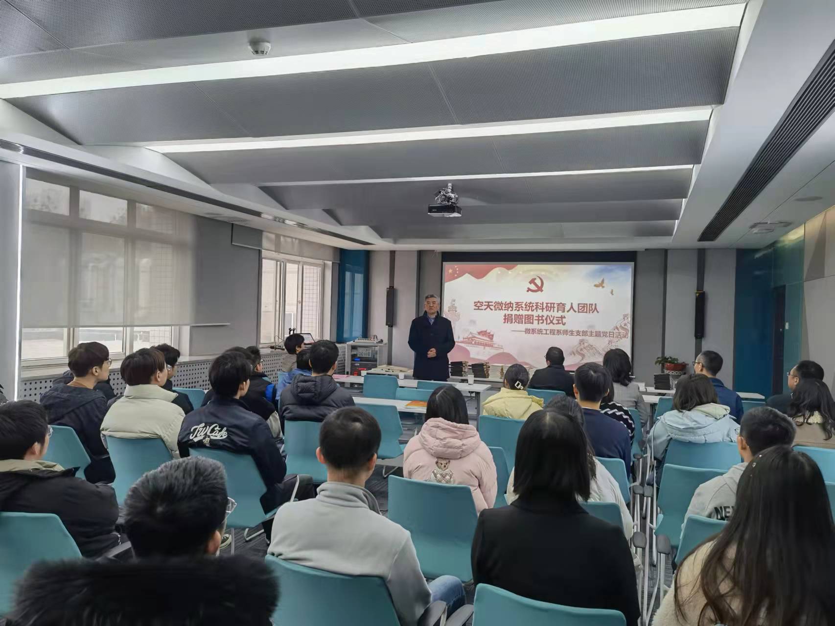 为深入学习贯彻党的十九届六中全会精神,深入推进“我为群众办实事”实践活动,营造浓厚的党史学习氛围。2021年12月10日上午,由开云kaiyun登录入口微系统工程系党支部与研究生第十二、十三党支部联合举办“空天微纳系统科研育人团队赠书促学习”主题党日活动。本次主题党日活动由微系统工程系党支部书记李晓莹主持,开云kaiyun登录入口党委书记张映锋、空天微纳系统教育部重点实验室主任苑伟政和师生代表参加了此次活动。