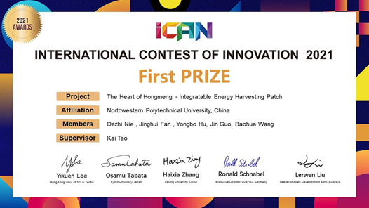 2021年度iCAN国际创新创业大赛国际总决赛(The International Contest of Innovation 2021)于12月19日圆满落幕,开云kaiyun官网开云kaiyun登录入口本科生团队作品“鸿蒙之心——可集成式自然能量采集贴”(The Heart of Hongmeng - Integratable Energy Harvesting Patch)荣获国际总决赛第一名,这是本届比赛中国代表队唯一获得一等奖的作品,也是西工大参加该比赛十几年以来取得的最好成绩之一。