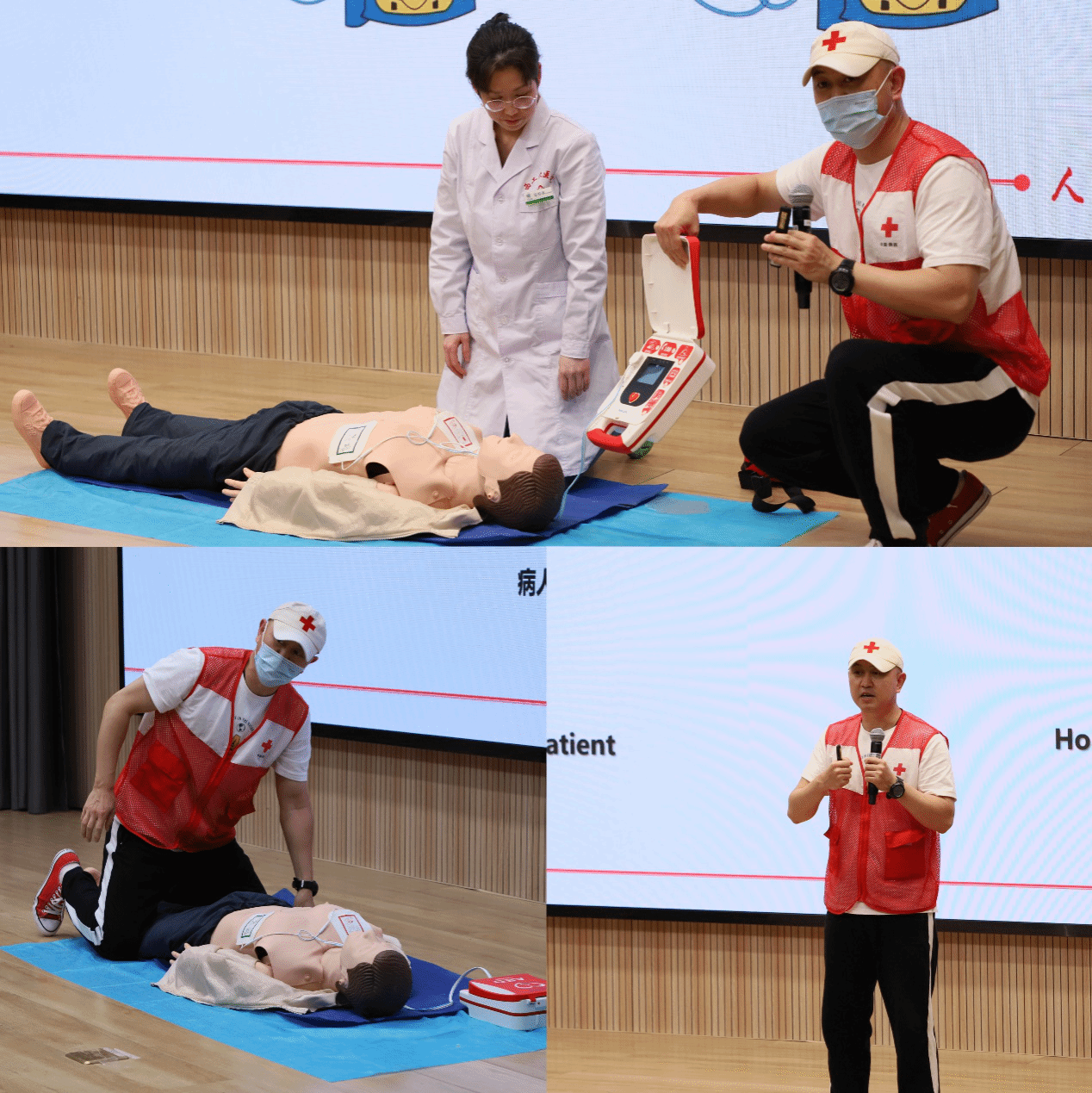 活动现场,红十字会应急救护培训师史晔灵结合理论知识和实际操作技巧,为同学们介绍了心肺复苏、海姆立克急救法、AED的快速使用等急救知识,史晔灵老师结合医生的现场示范,生动直观的展示了急救技能的相关要领。除此之外,史晔灵老师还介绍了针对特殊人群如孕妇、婴儿、肥胖人群等的急救办法。