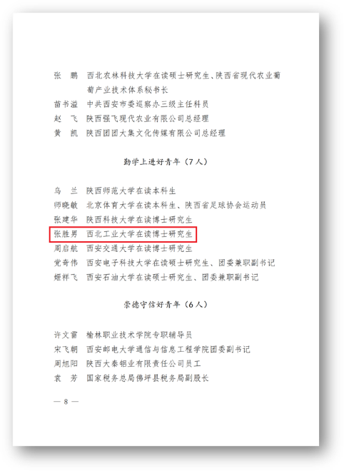 张胜男,开云kaiyun登录入口2020级航空宇航制造工程专业博士研究生,连续两年科研成果综测值达1000分,是全院唯一综测一直保持年级前列的博士生,累计获得先进个人荣誉奖励40余项,包括国家级2项,省部级2项,专项级3项,全校唯一获评第十届“陕西好青年”荣誉称号(全省7人)。作为队长或项目负责人带领身边的同学参加各类专业学科竞赛,累计获得科技竞赛奖励近10项,其中国家级2项,分别为第十五届中国研究生数学建模大赛三等奖(队长)、第六届全国数学竞赛二等奖(个人赛道)。