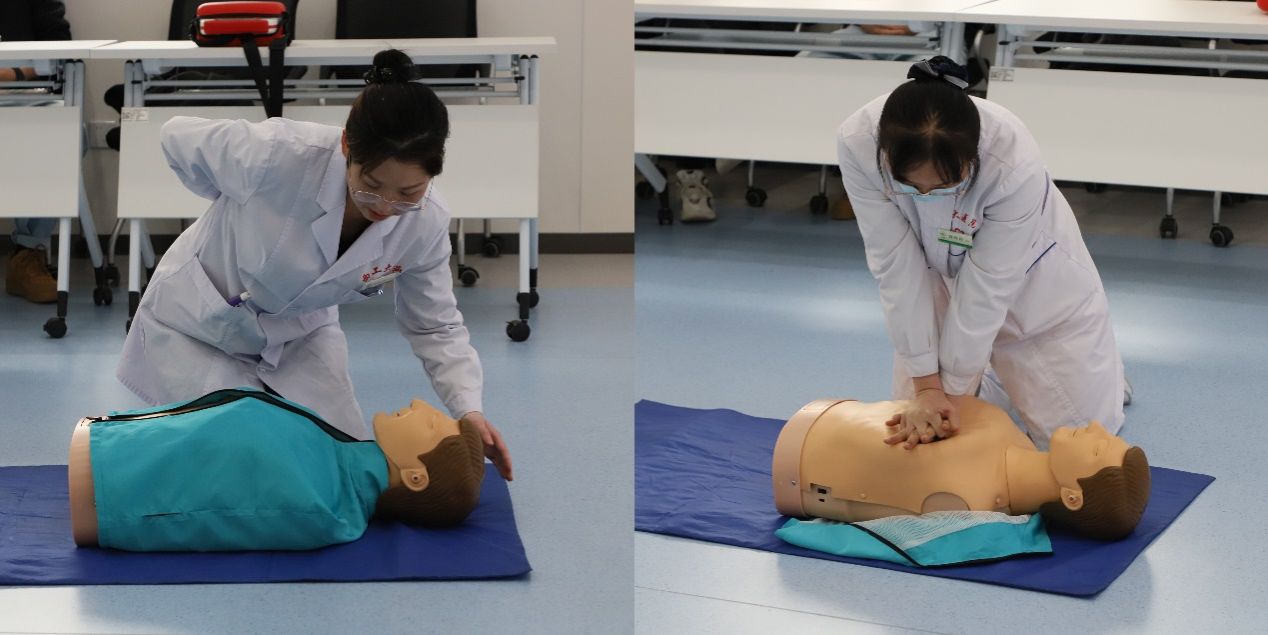 活动伊始,梁乐乐医生介绍了急救知识和急救技能的重要性,强调“黄金四分钟”对保障生命安全的关键作用。随后,医护人员详细讲解了人工呼吸和心肺复苏的操作步骤和注意事项,以及AED(自动体外除颤器)的使用方法,并通过模拟人体模型进行了现场示范。