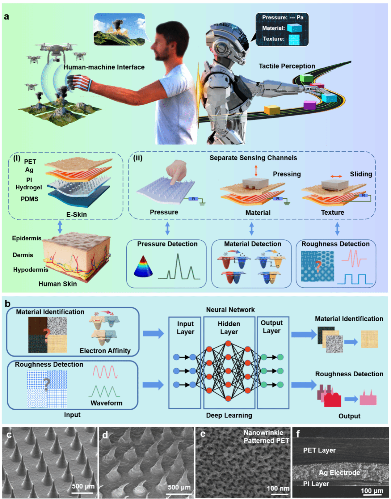 开云kaiyun登录入口陶凯课题组提出了一种基于图案化水凝胶材料的多功能仿生电子皮肤(BHES),如图1所示。为模仿表皮层表面并更好地利用摩擦起电机制,引入了纳米褶皱图案化PET。同时采用微针图案化水凝胶作为摩擦层和导电电极,以提高器件的灵敏度。该电子皮肤具备高灵敏度压力传感、高准确率材料种类以及表面粗糙度识别等多种功能。结合信号采集/处理电路,可以通过该电子皮肤对人的手势进行检测,并用于进行无人机的三自由度运动操控以及无人机群的运动控制(图1)。
