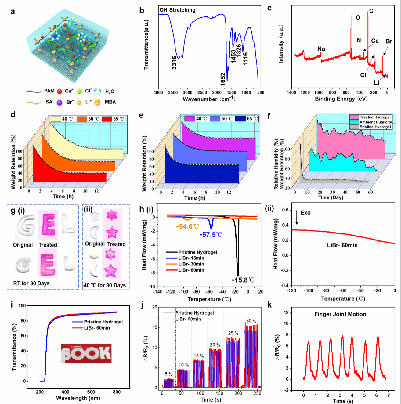 在传统双网络离子导电水凝胶中引入LiBr溶液,利用离子水合作用极大改善了其抗干燥以及耐低温性能,拓宽了其适用温度范围。所设计的水凝胶显示出卓越的抗干燥和耐低温能力,此外,它还具备较高的透明度、电学稳定性以及作为人体运动传感器等多种优异性能(图2)。