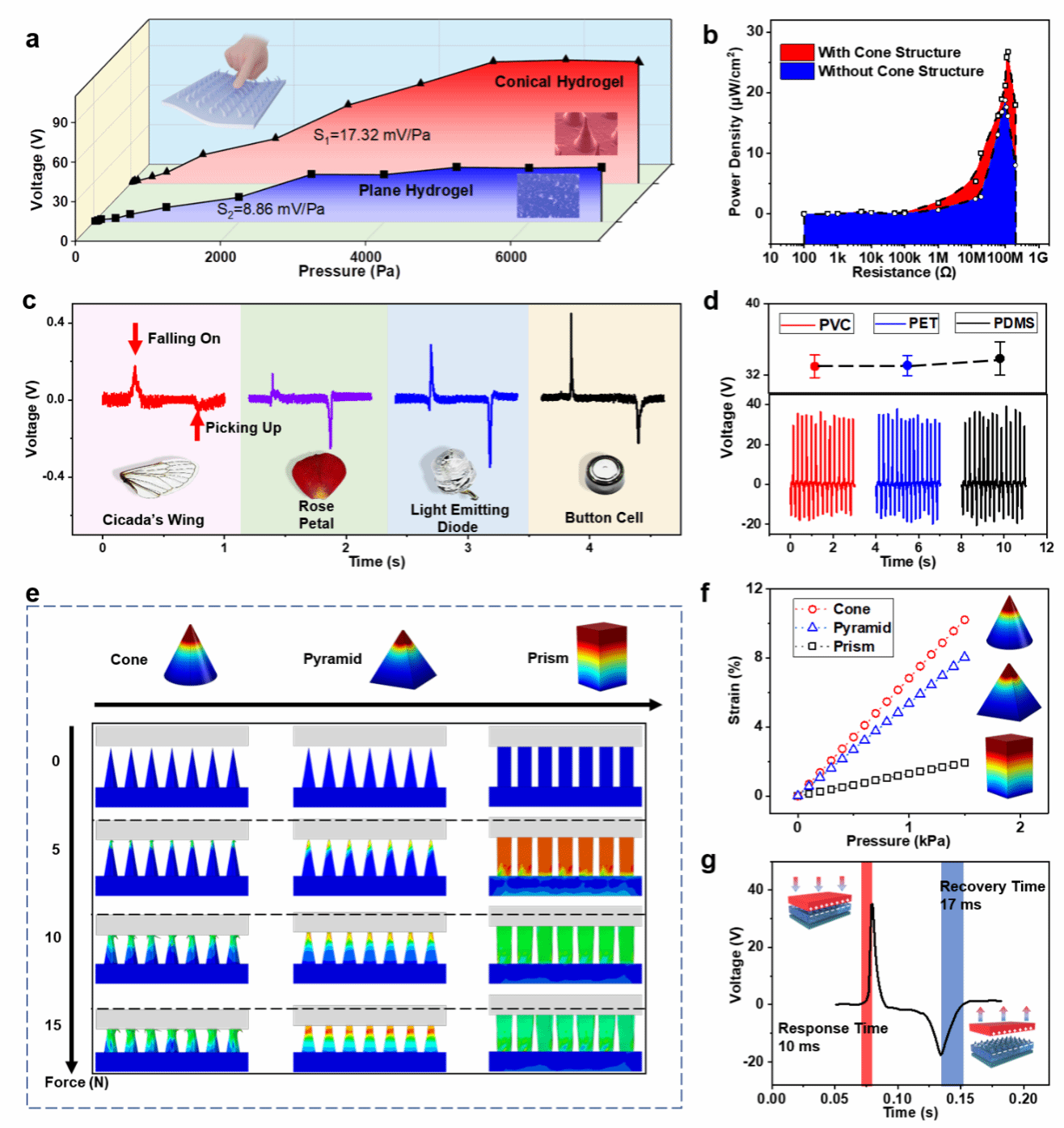 在该项研究中,首先通过仿真与计算优化水凝胶表面的微结构设计,并通过微纳加工工艺制备了表面带有微针结构的水凝胶电极材料,使得器件的压力传感灵敏度由8.86 mV/Pa提高到了17.32 mV/Pa。此外,设计的电子皮肤还具备微小物体检测和快速响应(10 ms)/恢复(17 ms)的特性(图3)。