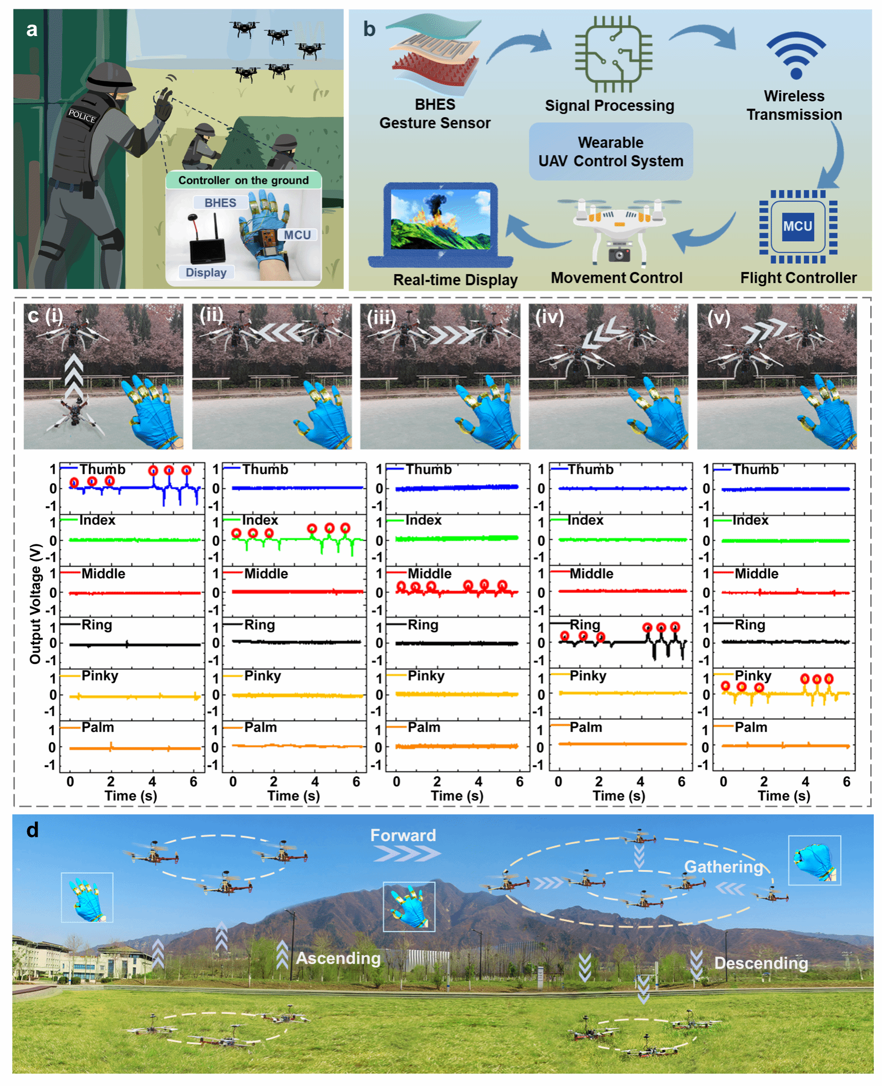 研究者基于BEHS,结合信号采集/处理电路,设计了一套可穿戴式无人机控制系统,实现了利用人体手势对四旋翼无人机的三自由度运动控制以及对无人机群的控制演示,有望在环境保护、森林防火救灾等场景中进行使用(图5)。该研究工作为智能机器人在数字孪生和元宇宙领域的应用提供了新的思路,并展示出在自供能人机交互界面系统的应用潜力。