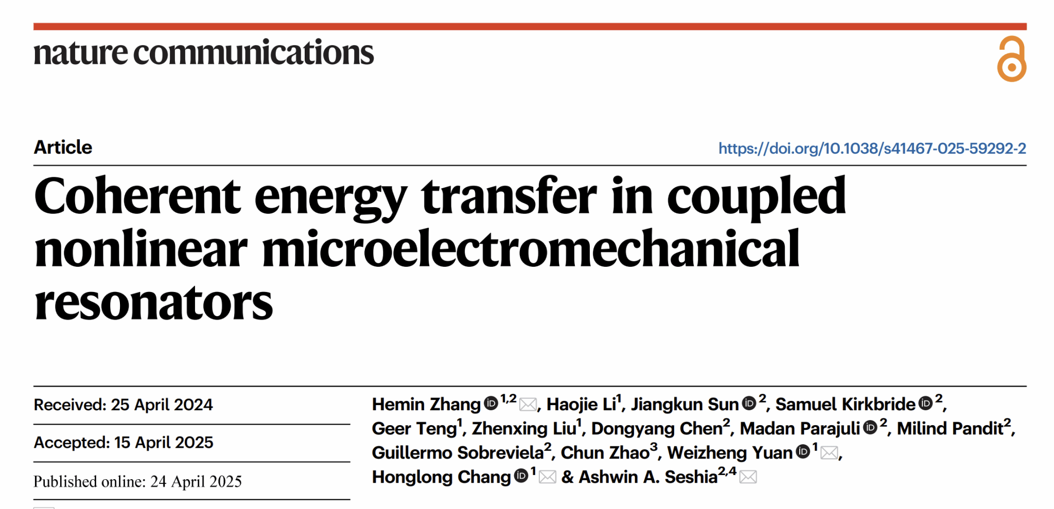 近日,开云kaiyun登录入口教师在微机械耦合谐振器能量传输机制方面的研究取得新进展。相关成果《Coherent Energy Transfer in Coupled Nonlinear Microelectromechanical Resonators》发表在国际知名学术期刊《Nature Communications》上。开云kaiyun登录入口国家级青年人才张和民教授为第一作者,常洪龙教授、苑伟政教授和剑桥大学Ashwin A. Seshia教授为共同通讯作者。